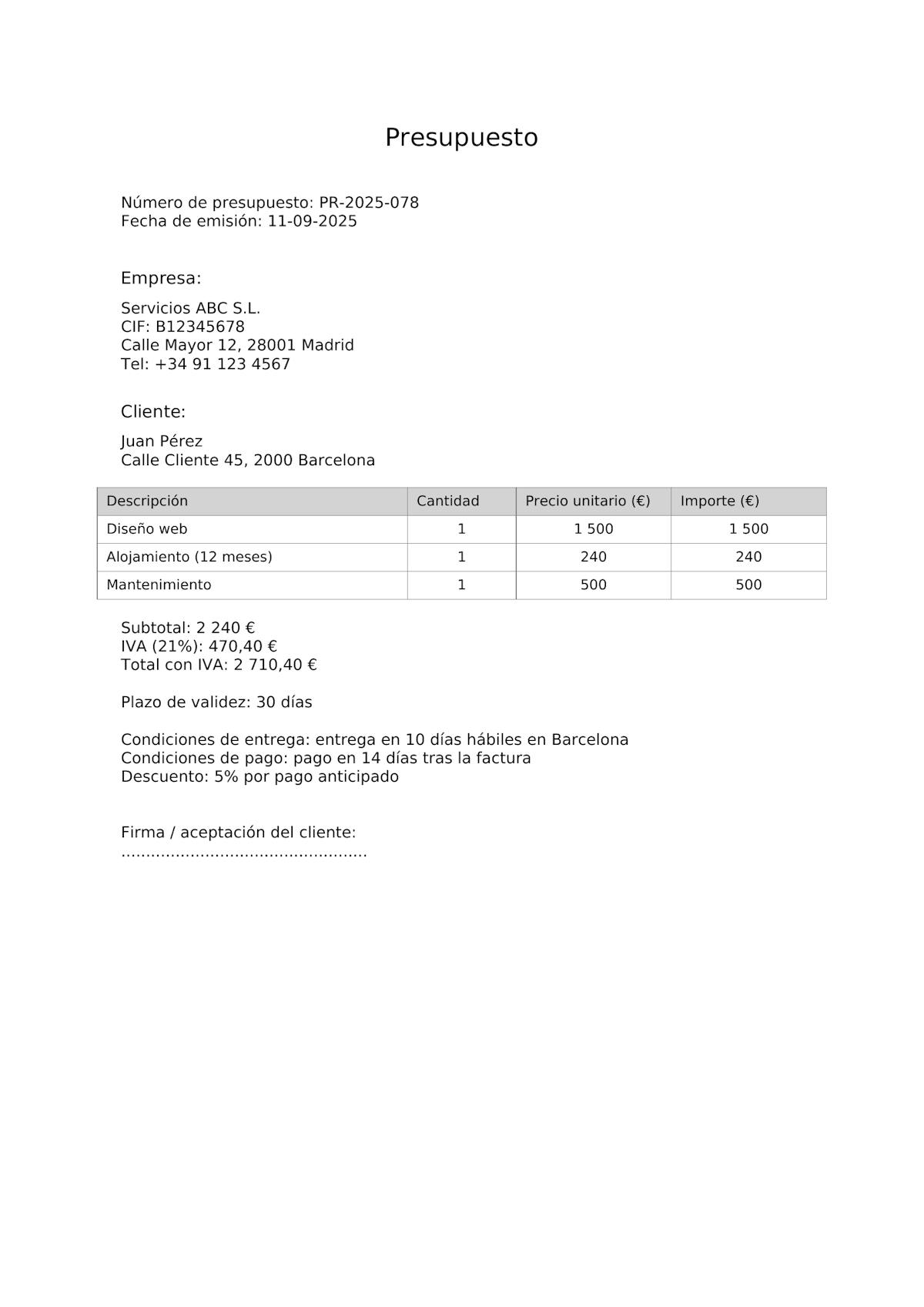 Incluya siempre un plazo de validez en el presupuesto (p. ej. 30 días). Esto protege a la empresa frente a cambios de precio y da al cliente un marco claro para decidir.