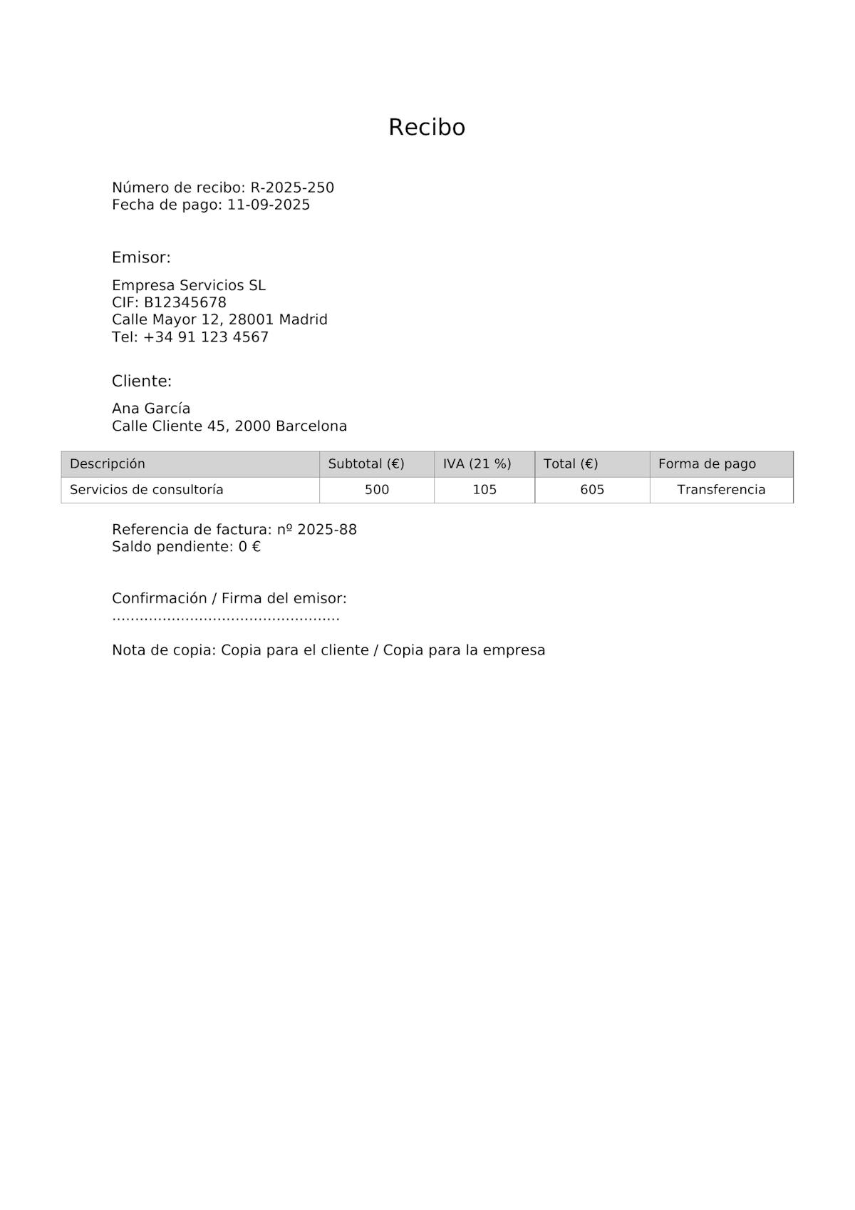 Numere siempre los recibos de forma correlativa y guarde copias en sus archivos. Esto facilita la contabilidad y cumple con los requisitos fiscales.